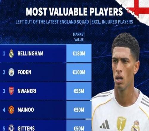 英格兰队公布了最新一期球队大名单,德转盘点了本次未能入选的球员身价榜(受伤球员除外)。1、贝林厄姆 (皇家马德...