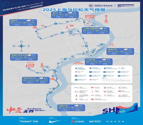 据最新气象资料分析,未来3天,上海以晴到多云天气为主,气温略有起伏。预计11月30日天气多云,偏南风3-4级,湿度20-80%,空气质量良,早晨气温10-11℃,赛事过程中升温较快,中午前后气温将达20-22℃,请上马参赛运动员注意合理补充水分和分配体力。