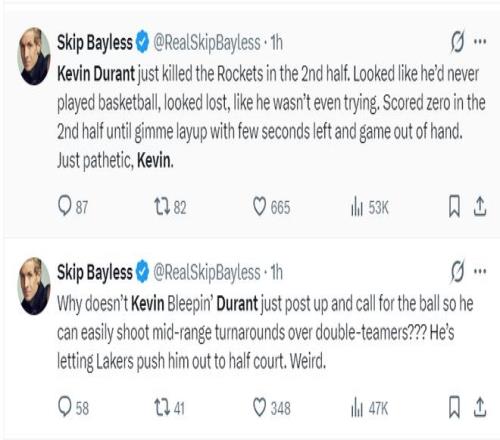 名嘴斯利普-贝勒斯疯狂朝他开炮:为什么KD不直接突破到篮下?他可以打无球啊,这样他就能轻松躲过双人包夹接球完成中距离投篮。他持球就被湖人逼到半场的位置,太奇怪了。